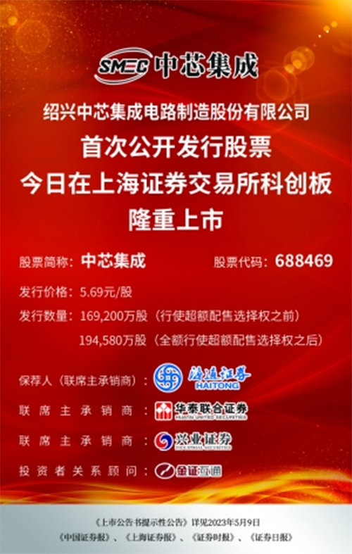 2023年5月10日,紹興中芯集成電路制造股份有限公司(公司簡稱“中芯集成”;股票代碼:688469)成功在上交所科創(chuàng)板上市發(fā)行,成為無錫創(chuàng)投集團收獲的第44家上市企業(yè)、第13家科創(chuàng)板上市企業(yè)。